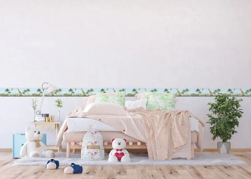 Explore different Jungle scenes and its adorable habitants with our charming designs, which are tailored to captivate any child. Crafted with love, each border adds a sprinkle of magic to your child’s room. Alongside our Jungle wall borders, explore our range of textile products, wall stickers, and murals to complement the theme seamlessly.