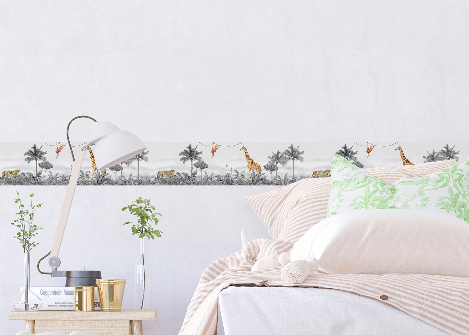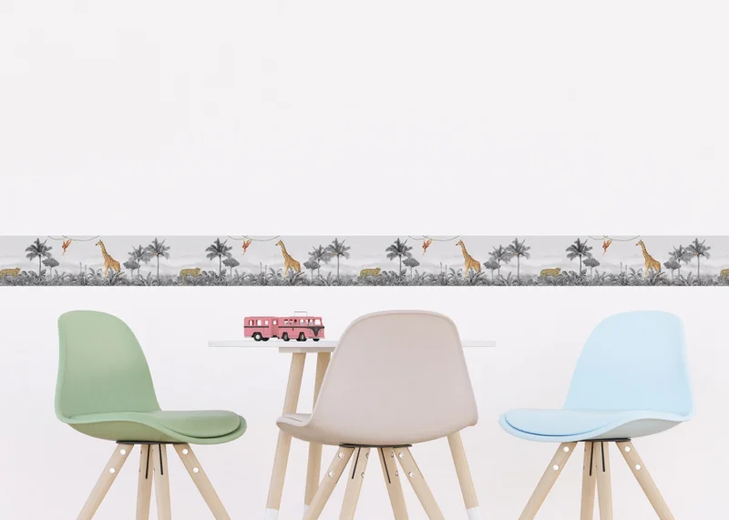 Explore different Jungle scenes and its adorable habitants with our charming designs, which are tailored to captivate any child. Crafted with love, each border adds a sprinkle of magic to your child’s room. Alongside our Jungle wall borders, explore our range of textile products, wall stickers, and murals to complement the theme seamlessly.
