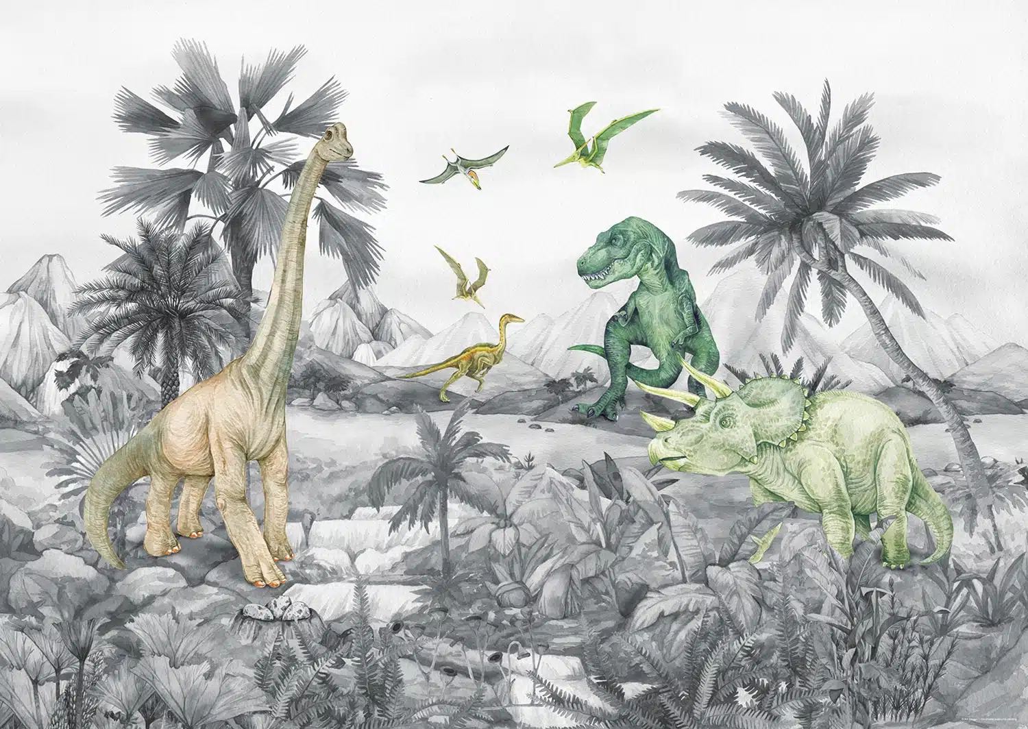 Step into prehistoric adventure right in your child’s room with our delightful Dino wall mural! Designed to infuse warmth and joy into their space, these photomurals bring a playful touch to any kid’s haven. Bring your little explorer into a land of ancient wonders and colossal creatures, igniting their imagination and love for different dinosaurs!