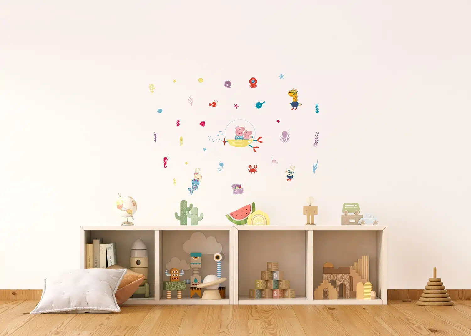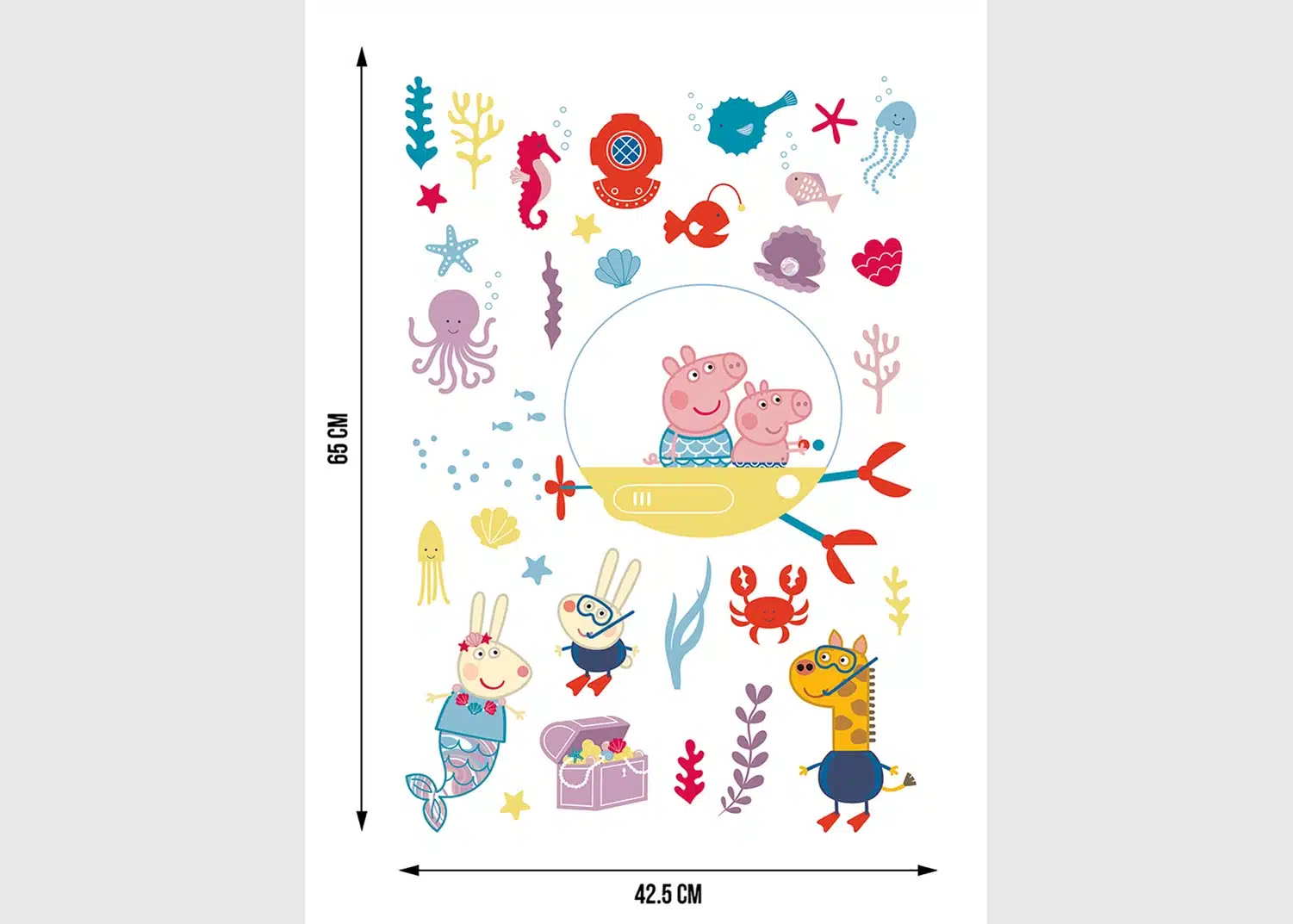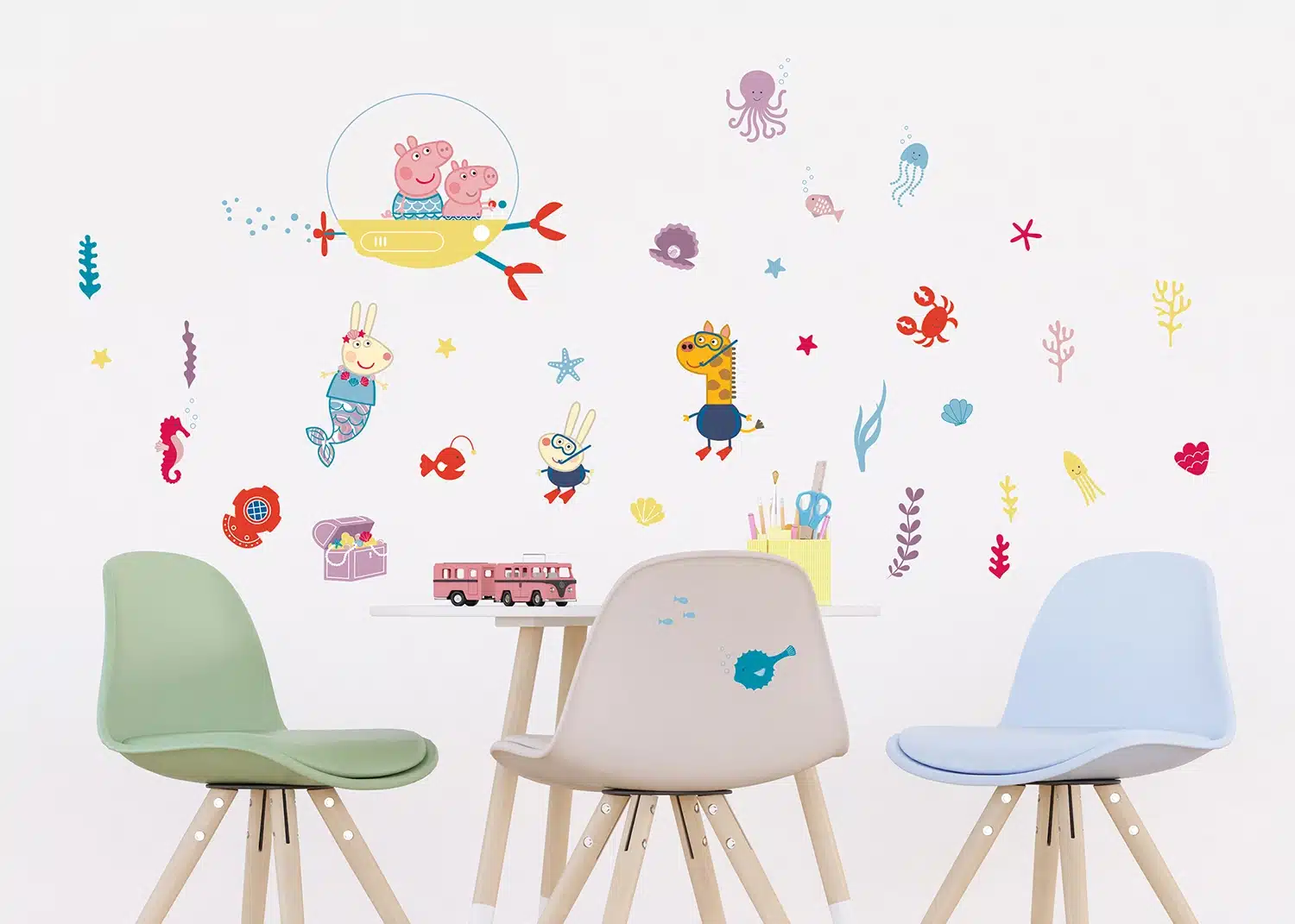 Explore different Peppa’s adventures from delightful picnics to underwater expeditions with our designs, which are tailored to captivate any child. Crafted with love, each sticker adds a sprinkle of magic to your child’s room. Alongside our Peppa Pig wall stickers, explore our range of textile products, wall borders, and murals to complement the theme seamlessly.